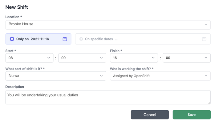 3. Check the location is correct - if it isn't, close the shift modal and select a new location under the site specific section and repeat steps 1-2